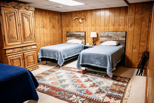 The farmhouse bedrooms feature multiple beds, each dressed in simple, comfortable linens and soft pillows. The room’s down-to-earth charm offers a warm, inviting space to rest and unwind.